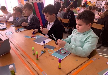 мастер-класс с учащимися четвертого класса "Открытка для папы", где участники с помощью шаблона, цветной бумаги, картона и клея сделали открытки.
